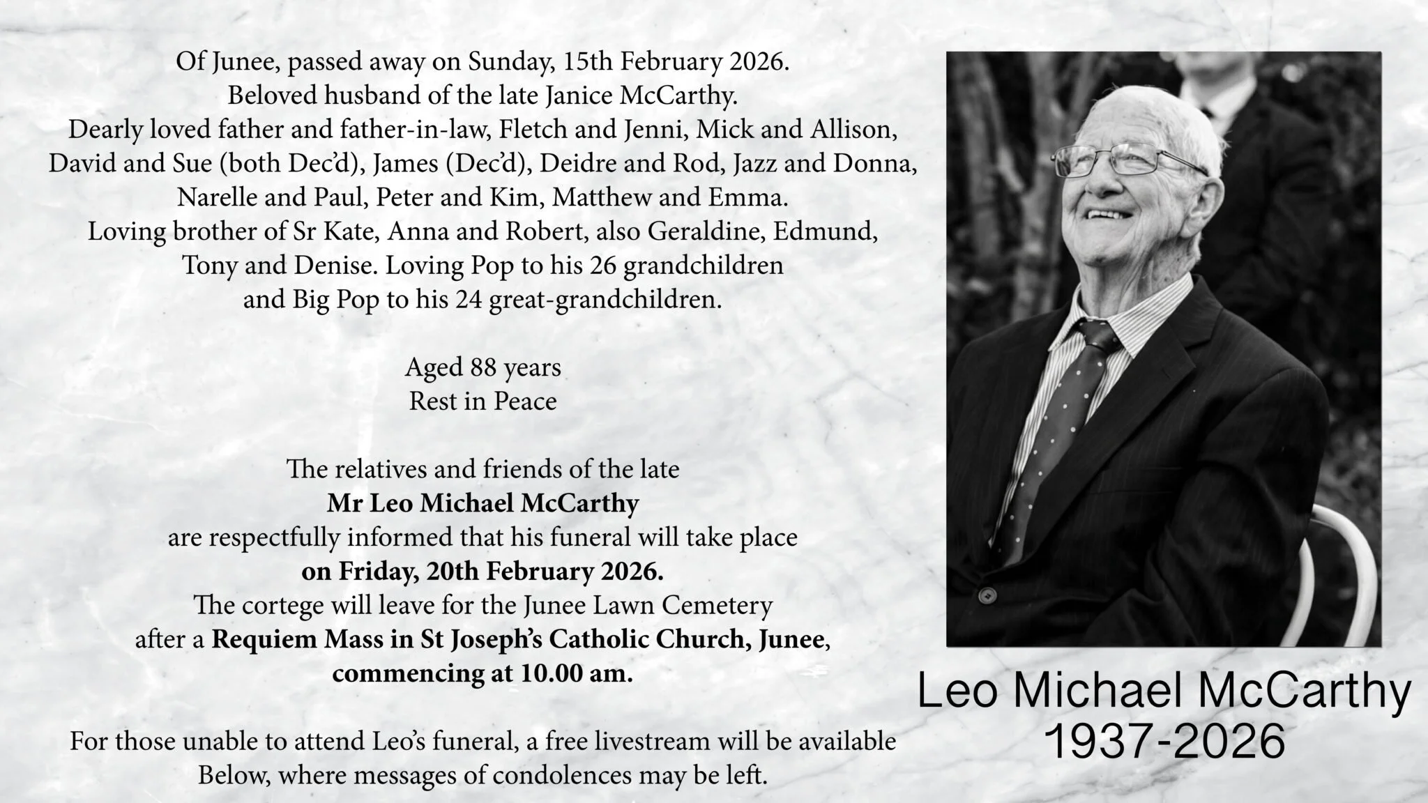 MCCARTHY, Leo Michael 15 Feb Written By Justine Brentnall Send a Condolance Message Justine Brentnall